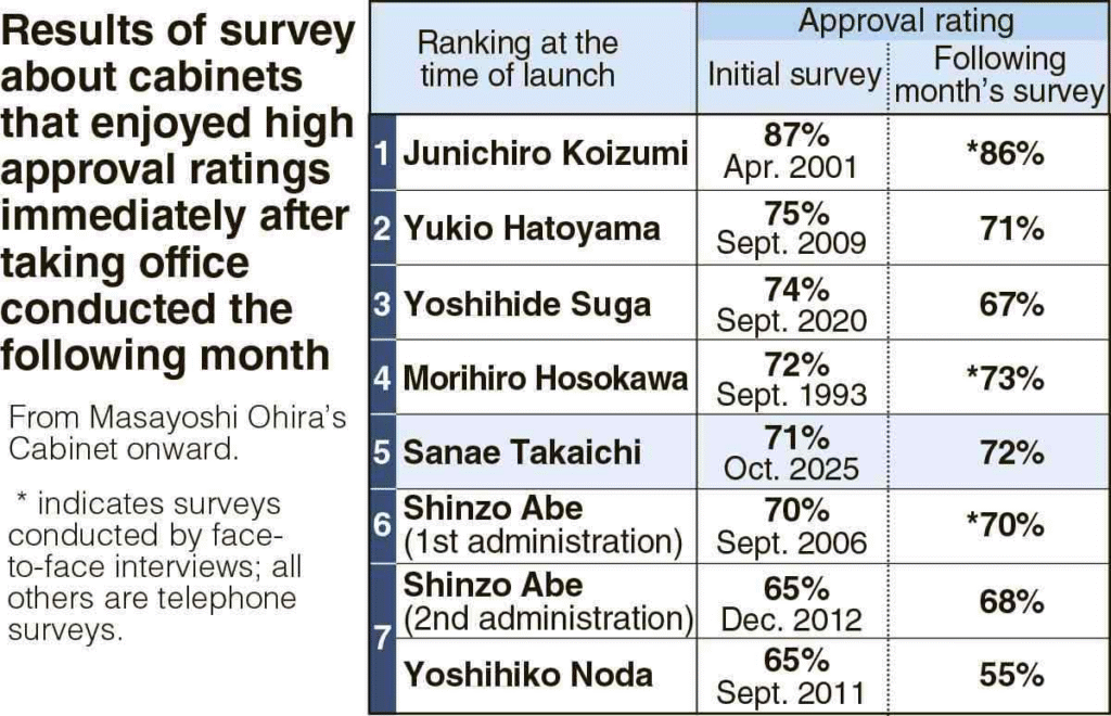 With the revolving door of Prime Ministers that Japan is known for, approval ratings often fall soon after coronation, though Takaichi can count herself as among the rare few who have managed to maintain their popularity, with 72% of polling respondents approving of her performance, roughly take same as when she took office.