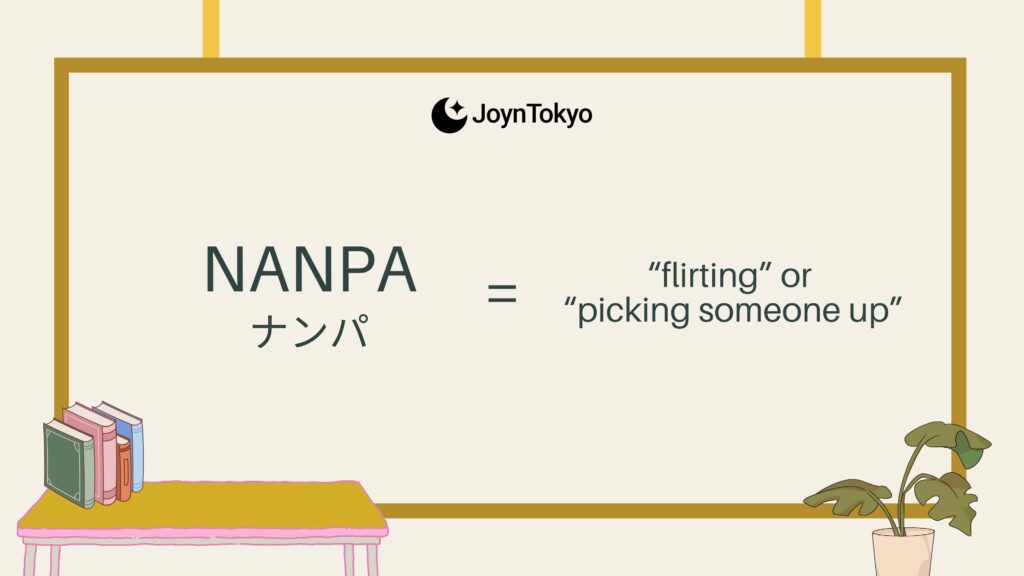 The word nanpa (ナンパ) is Japanese slang for “flirting” or “picking someone up”, usually on the street or in public spaces. It originally came from the term nanpa (軟派), which literally means “soft faction” — once used in the 20th century to describe men who were more interested in fashion and romance than politics or academics.