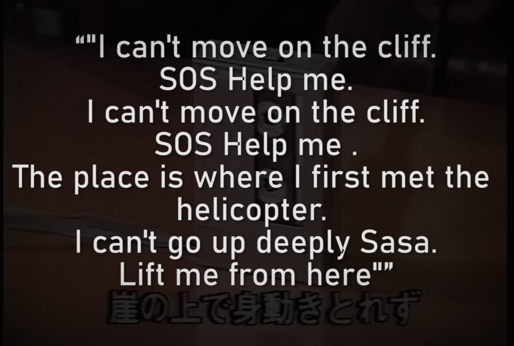 “SOS! Please help me! I’m stuck on the cliff! I’m at the location where I first met the helicopter! The sasa is thick, and I can’t climb up! Please pick me up!”